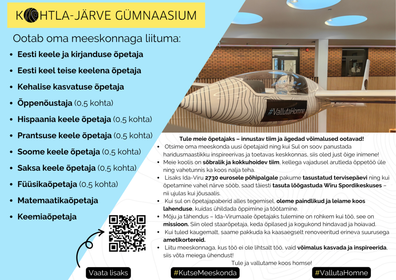 Lisaks oleme valmis tööle võtma õpetajaid, kes pakuvad huvitavaid valikaineid.