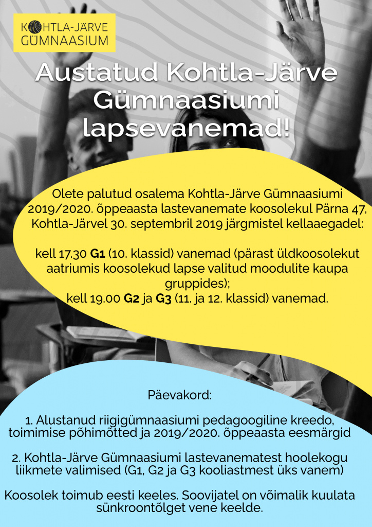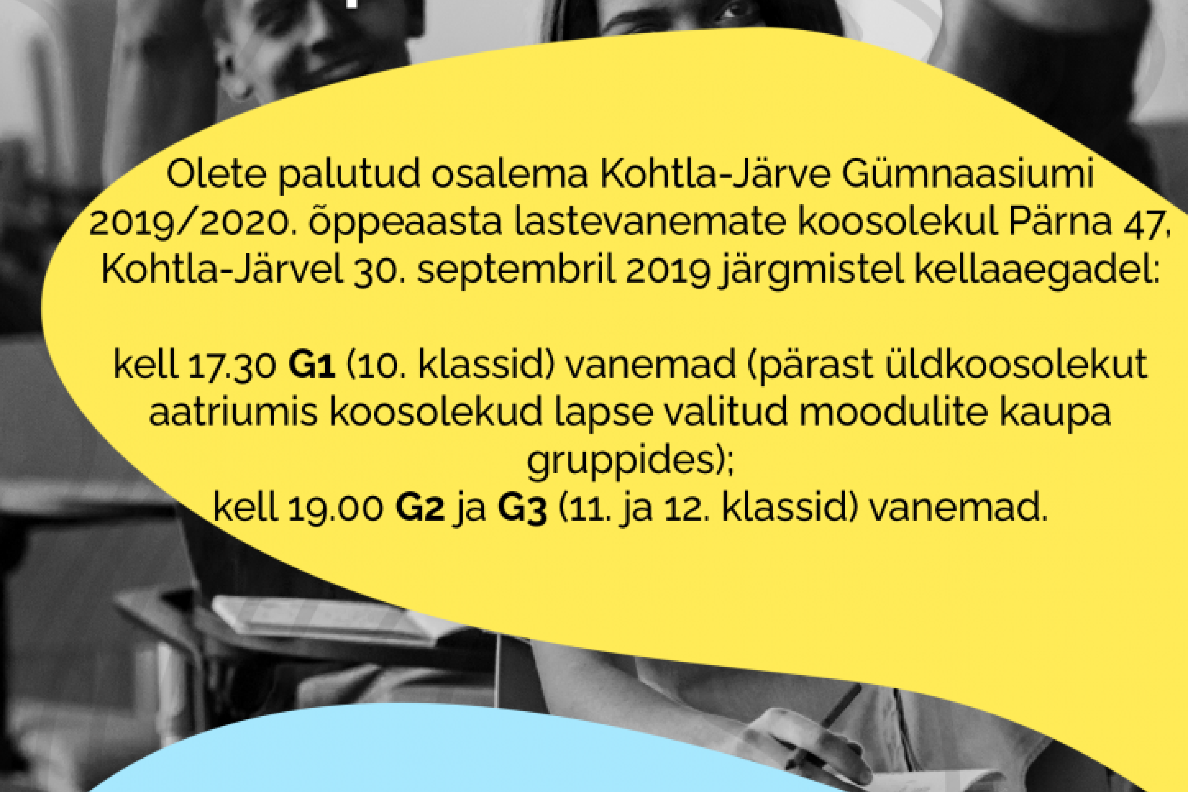 Olete palutud osalema Kohtla-Järve Gümnaasiumi 2019/2020. õppeaasta lastevanemate koosolekul Pärna 47, Kohtla-Järvel 30. septembril 2019 järgmistel kellaaegadel: