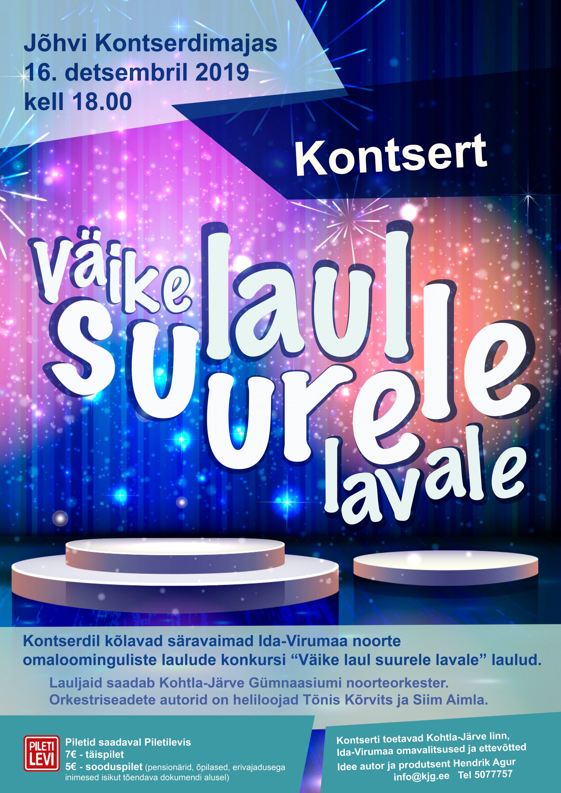 Kontserdil ‘’Väike laul suurele lavale’’ kõlavad sügisel konkursile esitatud laulud, millele on heliloojad Tõnis Kõrvis, Siim Aimla ja Teno Kongi teinud toredad orkestriseaded. Lood kõlavad Jõhvi Kontserdimaja suurel laval Kohtla-Järve Gümnaasiumi noorteorkestri ja Ida-Virumaa koolide solistide esituses.