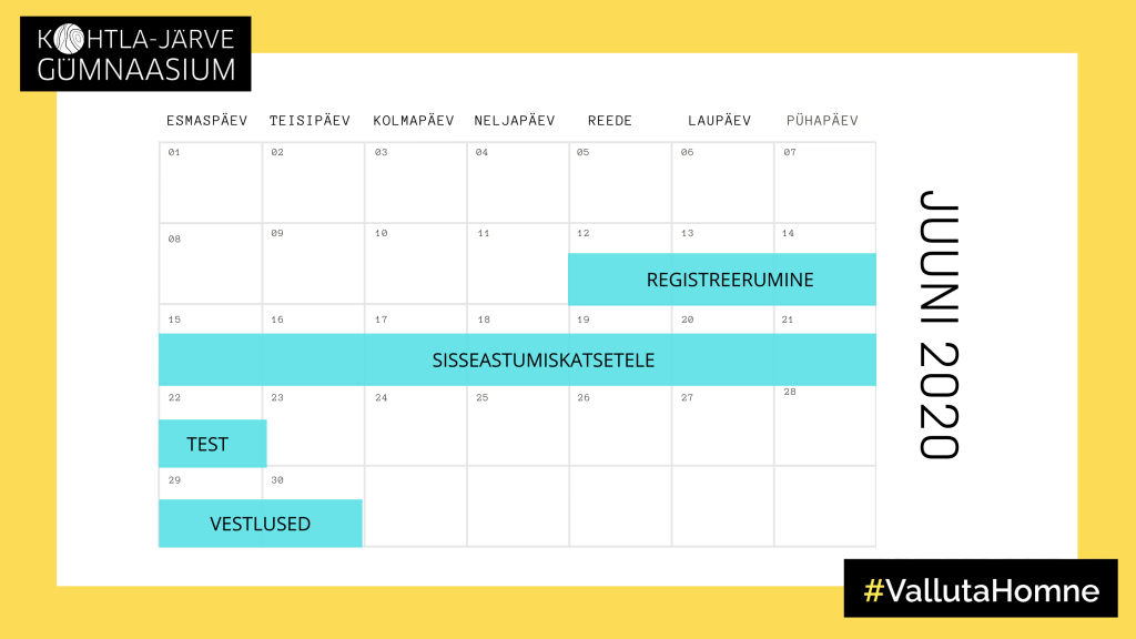 Sisseastumistest algab 22. juunil kell 10.00 Kohtla-Järve Gümnaasiumis, Pärna 47 veebipõhises õpikeskkonnas Moodle. Registreerunud õpilastele saadetakse eraldi kutse registreerumisel märgitud e-posti aadressil.