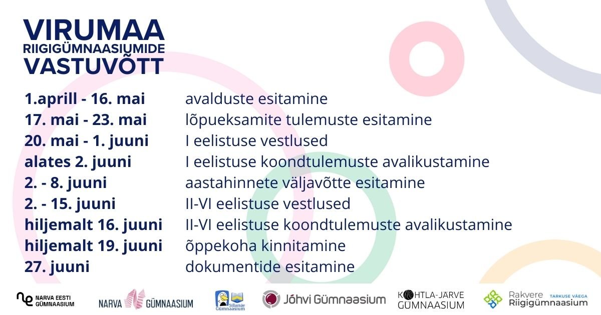 Käesoleval õppeaastal saab kandideerida korraga kuude erinevasse Virumaa riigigümnaasiumisse: Kohtla-Järve Gümnaasium, Narva Gümnaasium, Narva Eesti Gümnaasium, Sillamäe Gümnaasium, Jõhvi Gümnaasium ja Rakvere Riigigümnaasium.